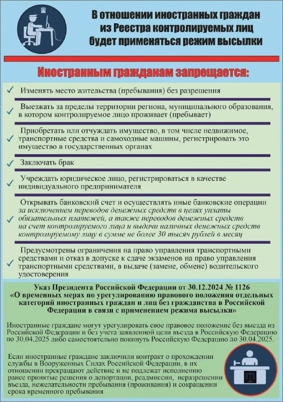 С 5 февраля 2025 года к иностранным гражданам, незаконно находящимся на территории Российской Федерации, применяется режим высылки, устанавливающий ограничения отдельных прав и свобод, а также иные меры федерального государственного контроля (надзора) в сфере миграции.