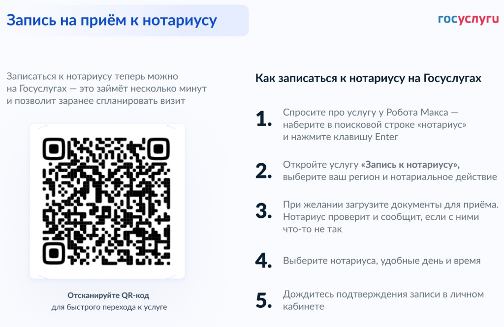 В Удмуртии записаться к нотариусу теперь можно онлайн через портал «Госуслуги». Всего для записи доступно около 50 услуг, в числе которых открытие наследства, согласие супруга на сделку, дарение и доверенности. При необходимости можно заранее отправить электронные копии документов для подготовки к приему.