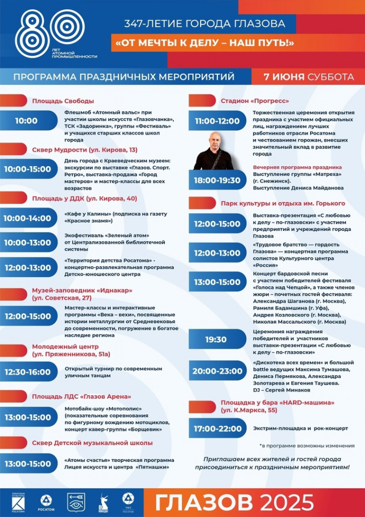 День города отметим 7 июня под девизом: «От мечты к делу - наш путь!» Важнейшая для Глазова веха – 80-летие атомной отрасли, которое Россия отмечает в этом году. Главная идея – становление Глазова через развитие предприятий города. Торжественное открытие на стадионе в 11:00. Завершим день большой дискотекой в парке.