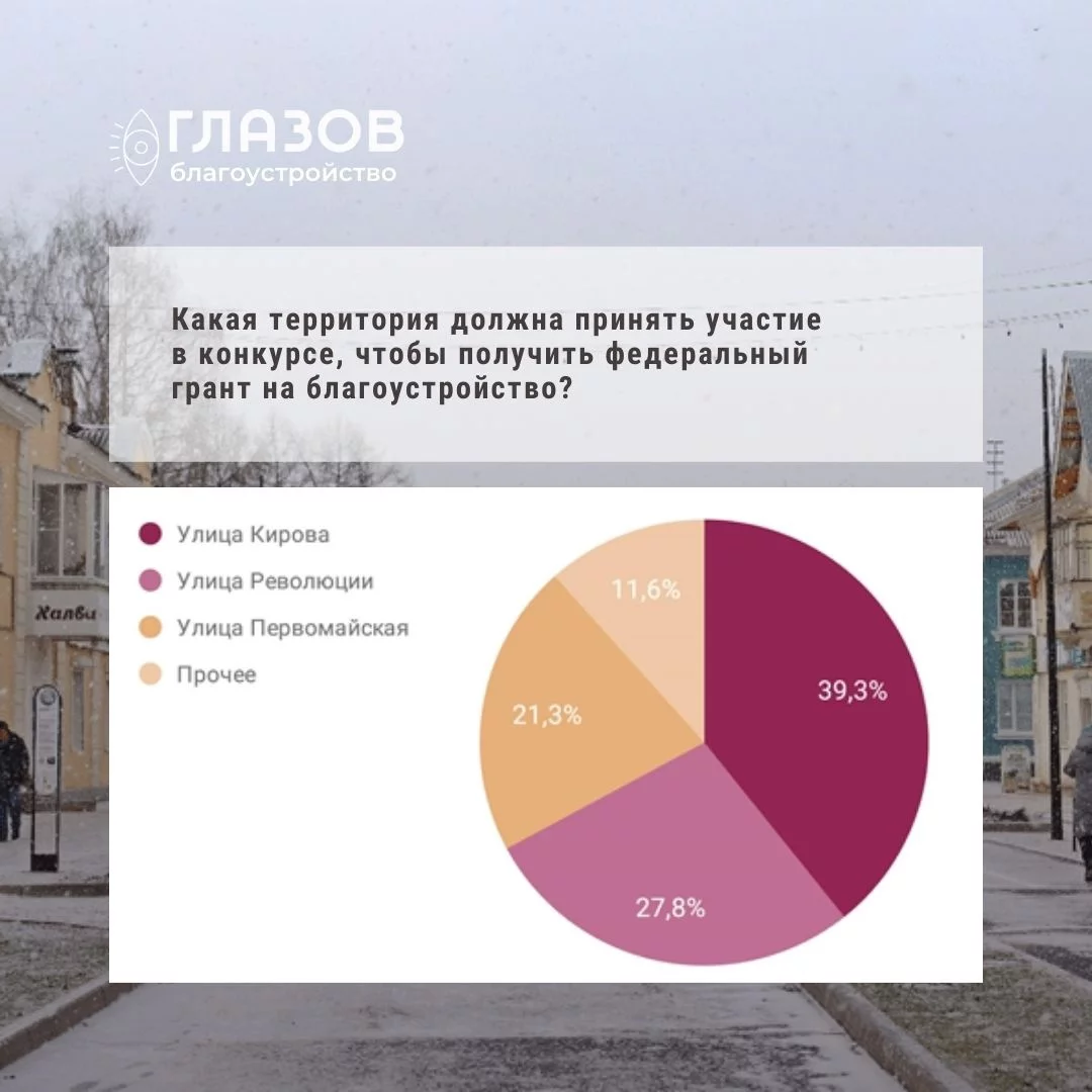 Таким образом, практически с 11%-м отрывом глазовчане выбрали дальнейшее развитие улицы Кирова и прилегающих территорий Культурного квартала.