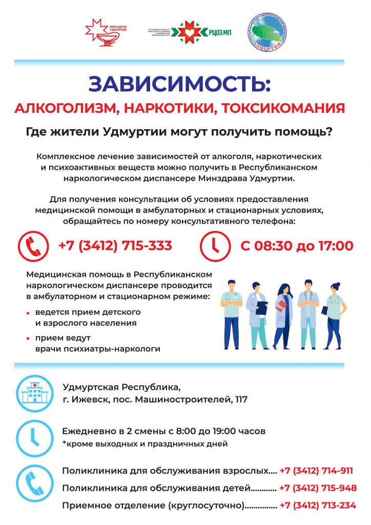 Где жители Удмуртии могут получить помощь? Комплексное лечение зависимостей от алкоголя, наркотических и психоактивных веществ можно получить в Республиканском наркологическом диспансере Минздрава Удмуртии.